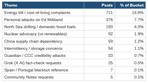 Replies to CCC coverage were also rooted in the disparity between the promise of cheaper bills and the lived experience of suffering through an era of unusually expensive energy (which is likely to get worse). North Sea drilling advocacy was also prominent in the mix, a Reform-led party line around UK self-sufficiency.