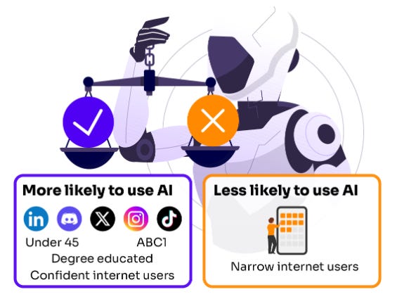 Or another combination of data points concerns the use of AI (bleeding into the hottest of hot topics, GEO). Ofcom found that genAI usage was highest among people who already use a range of different platforms. They also tend to be “professional”-type audiences: ABC1, degree-educated and under 45. There’s an emerging gap between those experimenting with and harnessing AI, and those who aren’t. Again, that feels like instinctively rich territory to explore - or at least a proof point to back up the importance of GEO and understanding how the different engines talk about your business and industry.