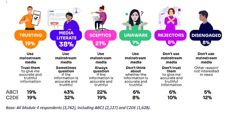 We also continue to see declines in trust of mainstream media, alongside outright rejection of both mainstream media and news in general. Nothing surprising or particularly interesting there. But perhaps we could combine this rejection of news with the fact that so many people get their news from social media (mainly Facebook), and with the types of stories mainstream outlets feel they have to post on Facebook to get algorithmic cut-through. My alt Facebook account follows a range of publishers, and the stories are almost overwhelmingly clickbait dross. If that were my media diet, I would turn off too.
